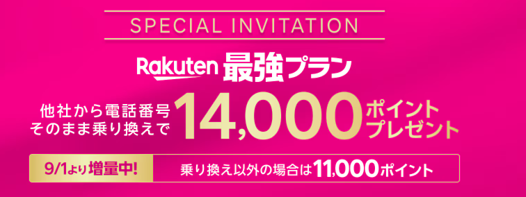 本物の三木谷キャンペーンは、正式名称を「楽天・三木谷浩史の特別なお客様キャンペーン」といい、他社からの乗り換えで最大14,000ポイント、新規契約で11,000ポイントがもらえます。