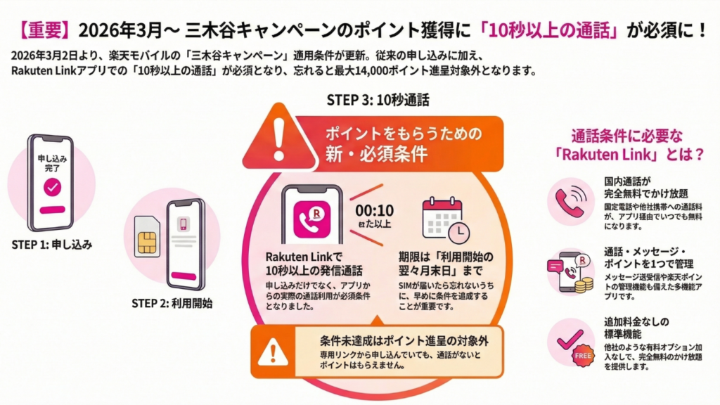 2026年3月2日から三木谷キャンペーンの適用条件が更新され、新たにRakuten Linkアプリによる通話が必須項目として追加されました。