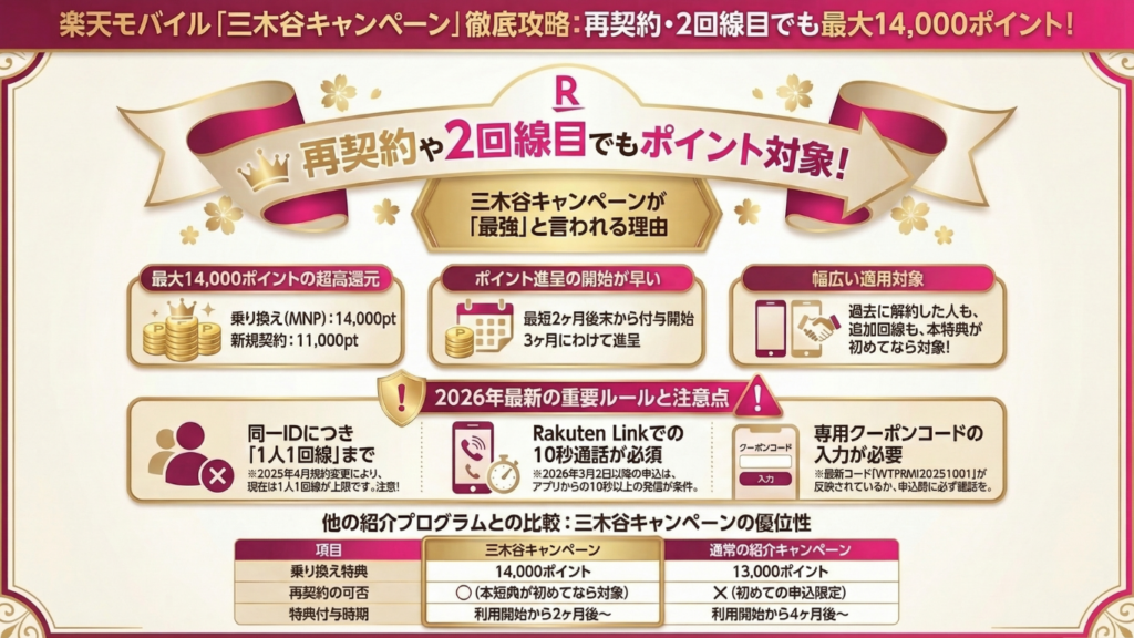 三木谷キャンペーンは、楽天モバイルを最も有利な条件で契約するための最強の手段であり、2026年3月現在も多くのユーザーに選ばれ続けています。