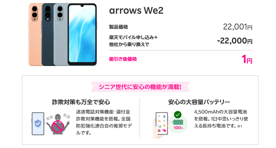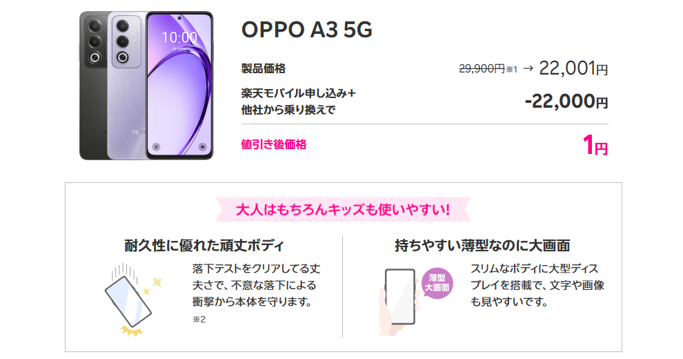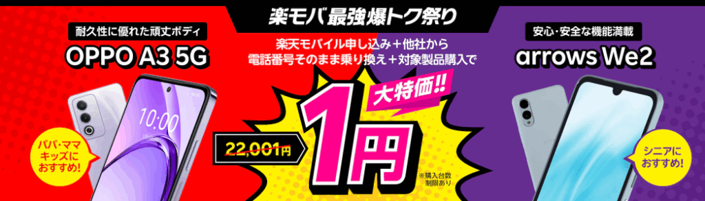どちらの機種も、楽天モバイルの回線契約と同時に申し込むことで1円に!キャンペーン期間中にお得にスマホを手に入れるチャンスです。