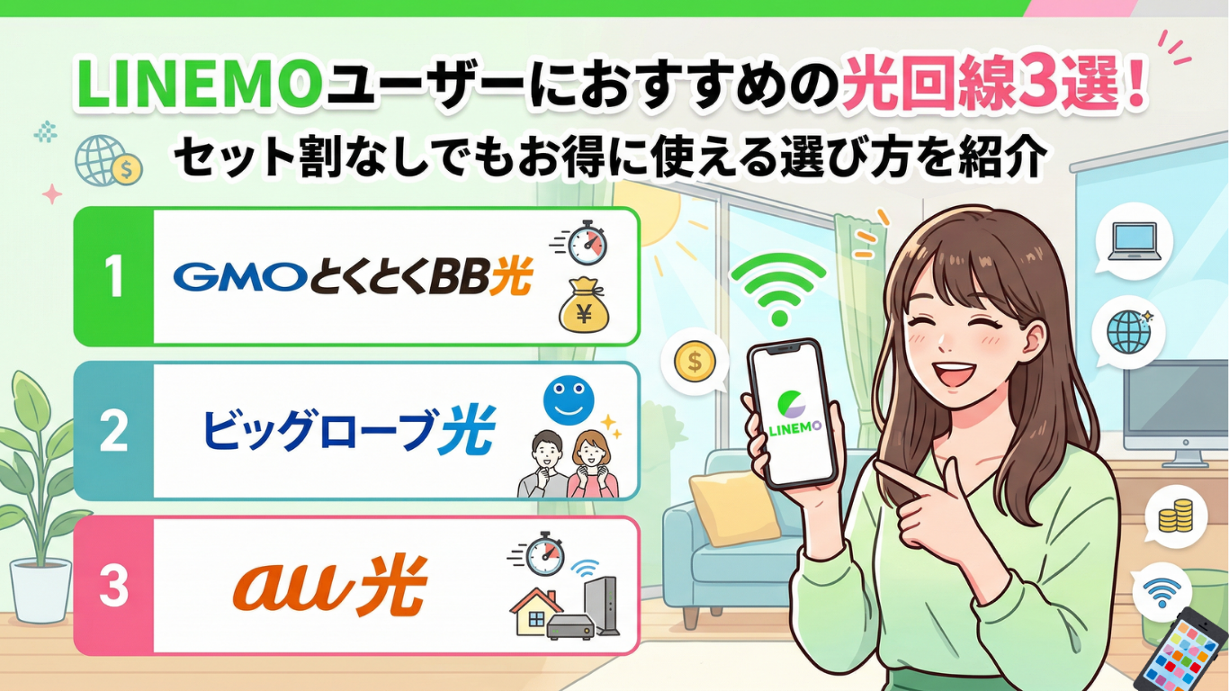 セット割がない分、光回線を「基本料金の安さ」「キャッシュバック特典」「解約条件の自由度」で純粋に比較できます。3社それぞれの特徴と、LINEMOとの組み合わせでのお得ポイントを詳しく解説します。